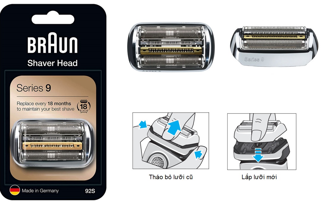 Hi cả nhà, hiện tại hãng đã ngừng sản xuất mã lưỡi trên và thay thế bằng mã 94M, do vậy shop sẽ ngừng bán các phiên bản mã 92S, 92B và 92M, Tất cả các máy dòng Braun Series 9 + Braun Series 9 Pro sẽ sử dụng chung mã lưỡi 94M, chi tiết về giá bán mã 94M các bạn tham khảo theo link sau: https://quanjapan.net/luoi-cho-may-cao-rau-braun-series-9-va-braun-series-9-pro