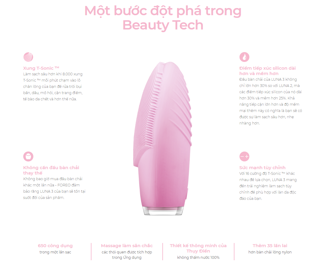 Foreo Luna 3 có thiết kế nhỏ gọn, vừa vặn trong lòng bàn tay, giúp bạn dễ dàng sử dụng hàng ngày. Sản phẩm được làm từ silicone y tế cao cấp, mềm mại và an toàn cho mọi loại da, kể cả da nhạy cảm. Điểm đặc biệt của Luna 3 là công nghệ T-Sonic™ độc quyền, với hơn 8.000 xung mỗi phút, giúp loại bỏ tới 99.5% bụi bẩn, dầu thừa và tế bào chết trên da.