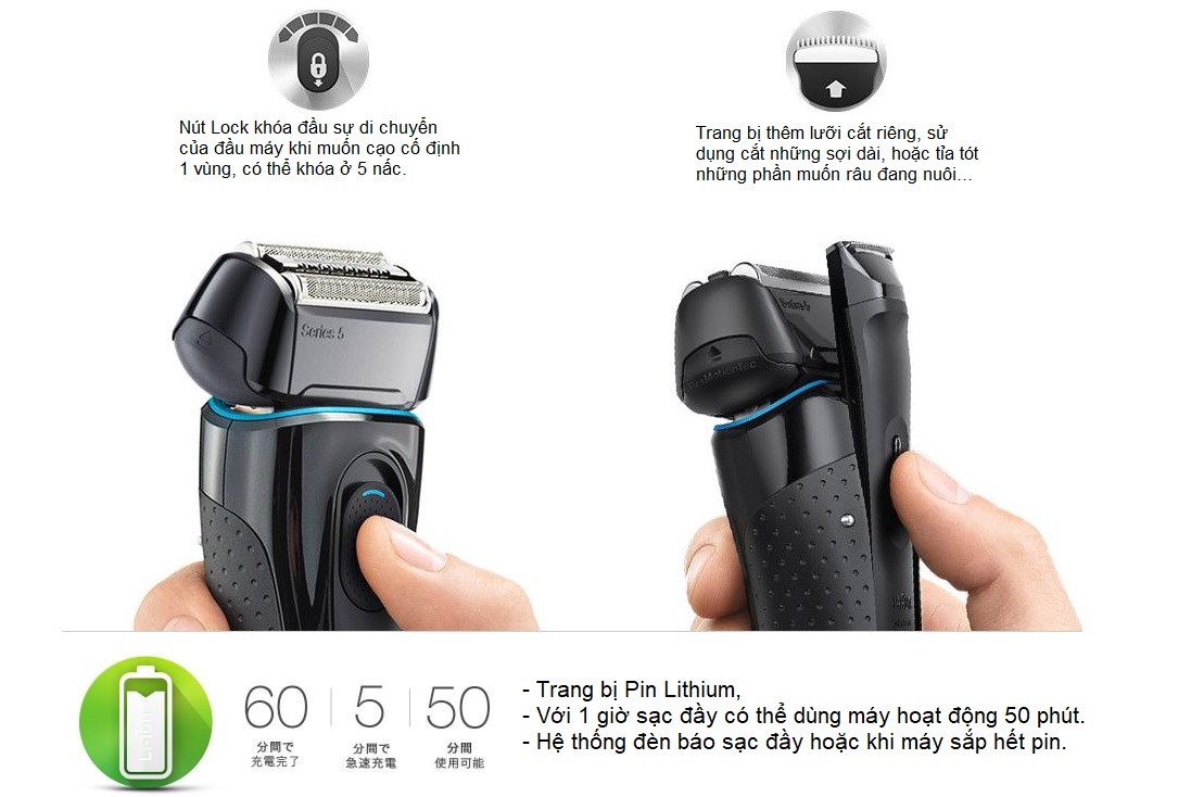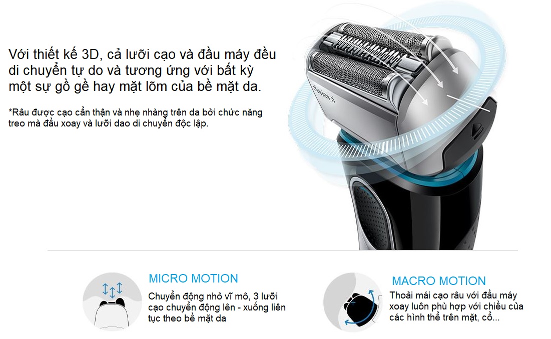 - Về lưỡi cạo: Trang bị 3 lưỡi cạo kép có thể di chuyển theo 8 hướng để phù hợp tương ứng với mọi bề mặt cạo.