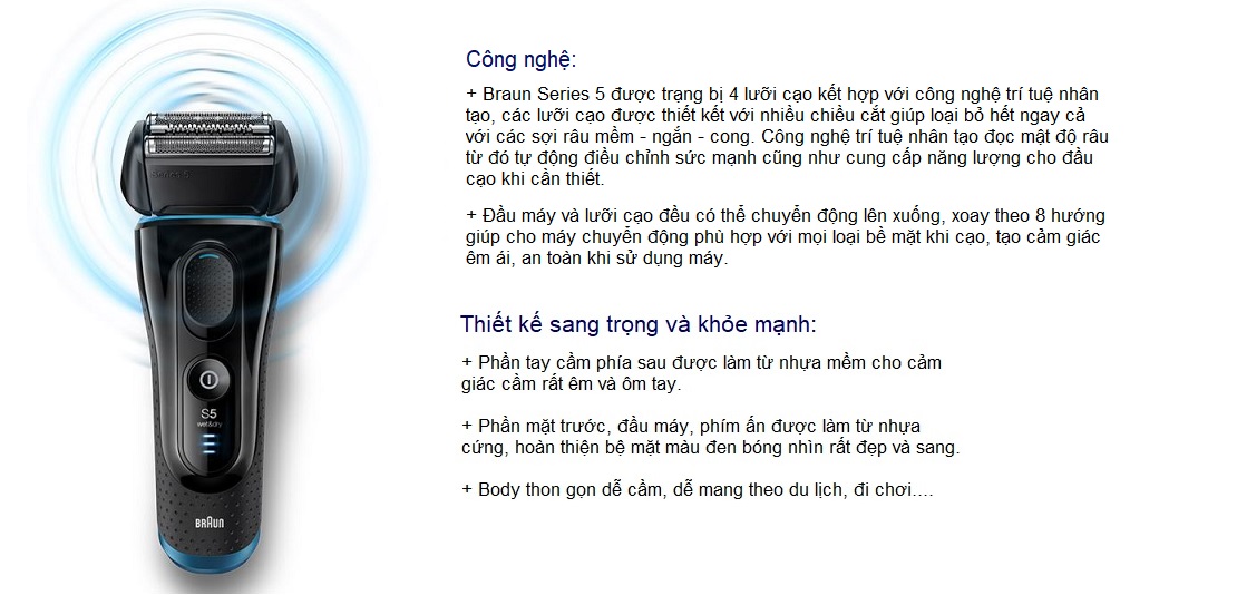 Máy cạo râu Braun Series 5 là model bán chạy nhất tính đến thời điểm hiện tại, công nghệ đầu cạo 3D với 4 lưỡi cạo kết hợp công nghệ trí tuệ nhân tạo, khả năng chống nước, thiết kế khỏe khoắn.....