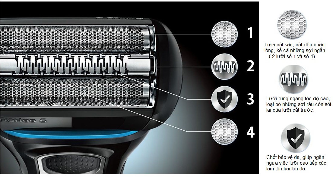 - Gồm 4 lưỡi cắt kết hợp với nhau như trên Braun Series 5, nhưng mình đã thử coi kỹ và sử dụng thì bên trong lưỡi cắt được trang bị nhiều lò xo hơn giúp cho việc các lưỡi cắt di chuyển lên xuống khi cạo cho cảm giác linh động hơn và êm hơn trên bản Series 5.