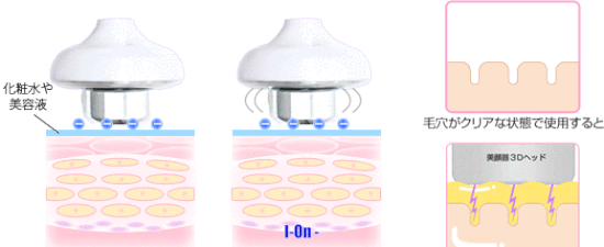 Máy sản xuất các I-On âm (-) , lúc này các mỹ phẩm dưỡng da sẽ hấp thụ các I-On này giúp nó mang điện tích âm (-) sẽ ở sâu chặt bên trong làn da vừa được làm sạch, Quá trình đẩy dưỡng của máy được kết hợp với chế độ rung sẽ giúp cho việc đẩy dưỡng vào sâu, nhanh và đều hơn.