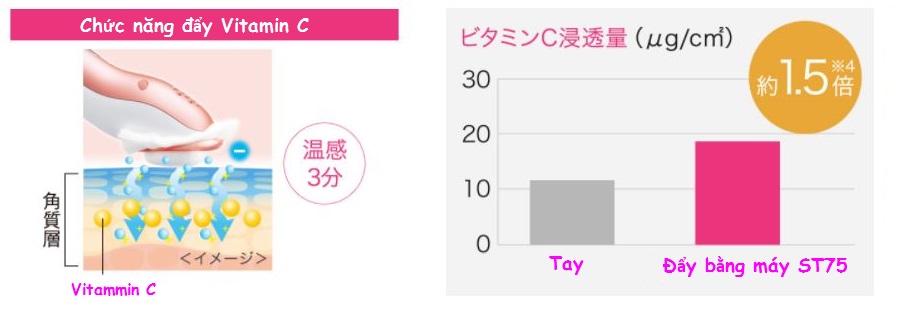 Hiểu được tầm quan trọng của Vitamin C trong việc chăm sóc da (làm sáng da, trị thâm...), model ST75 đã được hãng Panasonic trang bị cho riêng 1 chức năng để giúp người dùng đẩy các chất dưỡng Vitamin C vào trong da, khả năng đẩy dưỡng VitC được chứng minh là hiệu quả gấp 1,5 lần so với việc dưỡng da bằng tay thường, với chức năng này sẽ giúp các bạn chăm sóc làn da mụn, da không đều màu một cách dễ dàng hơn.