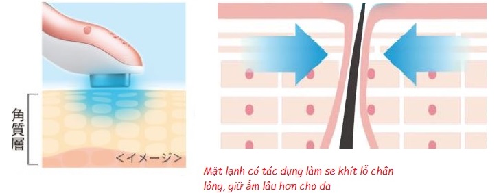 Sau 2 bước với nhiệt nóng để làm sạch và đẩy dưỡng thì ở bước này mặt máy lạnh khoảng 10 độ, có tác dụng khóa các lỗ chân lông lại, giúp thu nhỏ dần lỗ chân lông, giữ cho độ ẩm bên trong da lâu hơn, hơn nữa khi dùng mặt lạnh cho chúng ta cảm giác rất thoải mái dễ chịu 😉