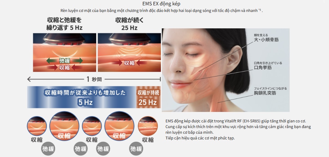 + Công nghệ sóng nâng cơ EMS tác động kép: sóng nâng cơ trên dòng máy này cảm nhận rất rõ và liên tục, có 3 mức level từ nhẹ đến mạnh, các bạn có thể cảm nhận rõ ràng khi thay đổi mức độ.