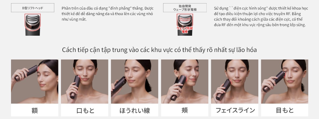 - Đầu máy được thiết kế đặc biệt để vừa vặn nhất với các đường nét trên khuân mặt, giúp cho nó dễ dàng tiếp cận tới tất cả các vùng trên da mặt, các điện cực được sắp xếp hình sóng để phát huy tối đa hiệu quả cho sóng RF, sóng EMS...