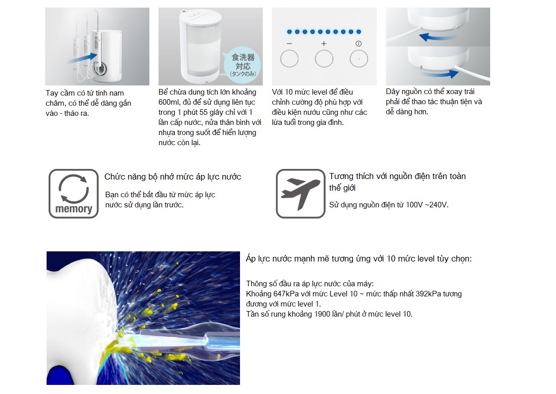 Kết luận: Đây là dòng máy tăm nước dạng to để bàn, về mức độ làm sạch có thể nói là tốt nhất trong các dòng máy tăm nước có trên thị trường hiện nay, dùng cho cá nhân hoặc gia đình đều phù hợp, với 10 mức level tùy chỉnh cường độ mức áp lực nước giúp phù hợp với nhiều loại nướu cũng như nhiều lứa tuổi, sử dụng điện 220V ở việt nam cũng là một ưu điểm tốt...nhược điểm duy nhất là hơi to, không nhỏ gọn dễ mang theo như 2 dòng Panasonic DJ10 và Panasonic DJ52.