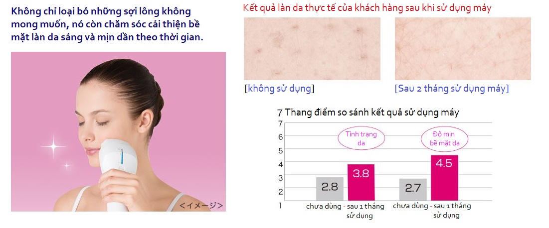 Công nghệ triệt lông: Đốt chân lông bằng nhiệt của ánh sáng quang sinh ra từ đầu đốt, sau mỗi lần đốt lông sẽ mọc lại chậm hơn, sợi lông tơ và mềm hơn....dần dần sẽ không còn nỗi lo về lông nữa...