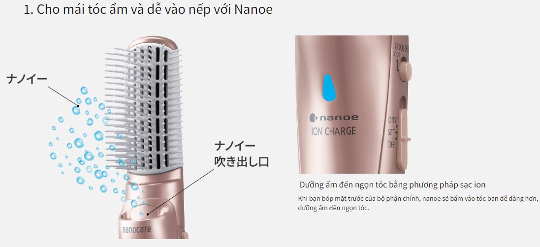 Các hạt Nanoe được phun ra ngay cạnh các đầu uốn sấy của máy, thiết kế này sẽ giúp toàn bộ các hạt Nanoe sau khi được thổi ra sẽ tiếp xúc với các lọn tóc trên đầu máy đang thao tác ngay lập tức, 1 lượng Nanoe khác cũng sẽ được thổi qua tóc để tiếp xúc đến chân tóc và da đầu.