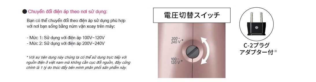 - Có thể sử dụng cho dải điện rộng từ 100V ~ 240V nên rất tiện lợi khi dùng ở Việt Nam, không cần dùng qua cục đổi nguồn.