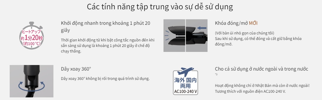 - Sử dụng được với nguồn điện từ 100v đến 240v (dùng trên toàn thế giới) mà không cần cục đổi nguồn điện.