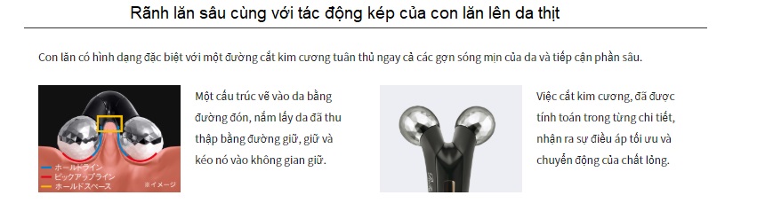 Với cơ chế bi lăn như kiểu massage nhào nặn trên da thịt liên tục, con lăn có tác dụng làm giảm, tiêu hao lượng mỡ, thịt thừa trên mặt, làm căng da, xóa dần các vết nhăn, vết xệ da, giúp khuân mặt trở nên nhẹ nhàng, đẹp theo cách tự nhiên mà không cần phẫu thuật thẩm mỹ, hơn nữa mắt lấy sáng trên thân cây lăn sẽ hứng ánh sáng và tạo ra các dòng điện sinh học cực nhỏ trên bề mặt con lăn, dòng điện này có tác dụng ngăn ngừa sự lão hóa, làm trẻ da.