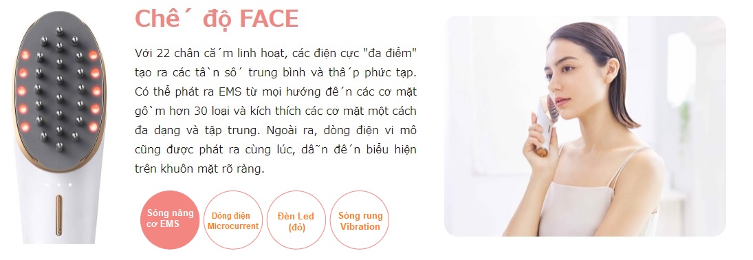 Sóng nâng cơ EMS sẽ kích thích các cơ mặt hoạt động giúp chúng dẻo dai sẵn chắc, Dòng điện Microcuren + đèn led đỏ giúp trẻ hóa da chống lại sự lão hóa của tuổi tác, sóng Rung Vibration khi sử dụng giúp tăng cường hiệu quả cho việc nâng cơ cũng như trao đổi, tuần hoàn của da.
